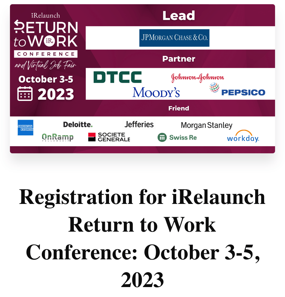 Hi Reader! I wanted to quickly pop this into your inbox, in case you're interested in a returnship. One of the largest organizations in the workforce re-entry space, iRelaunch, is hosting a virtual career conference in October that you won't want to miss. π₯ Part of the conference includes live networking with recruiters for returnship employers β These employers are looking to hire people just like you, coming off a career break. Yup. ππ» ππ» ππ» And registration is zero dollars right now! Yup....